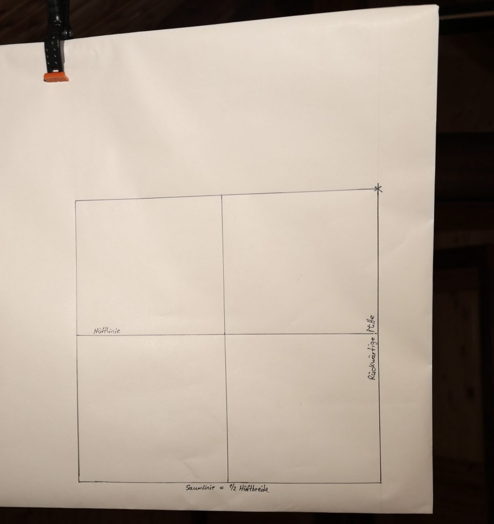 Wir beginnen damit, ein Grundgerüst zu zeichnen. Das Grundgerüst hat die Breite des halben Hüftumfangs (inkl. der Zugabe aus unserem Maßsatz) und die Länge des Rocks.