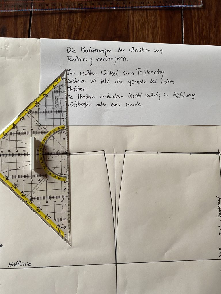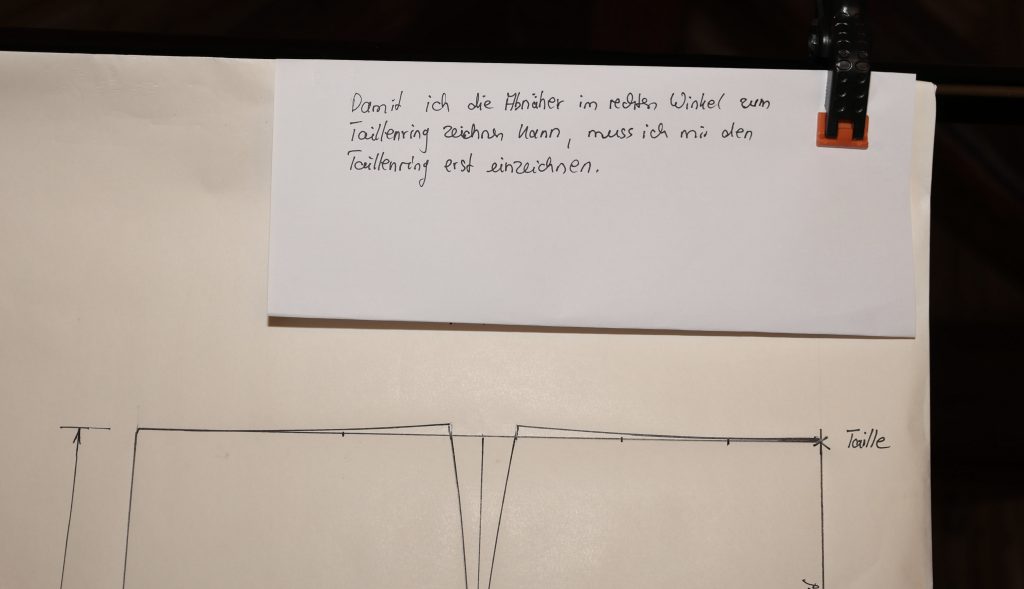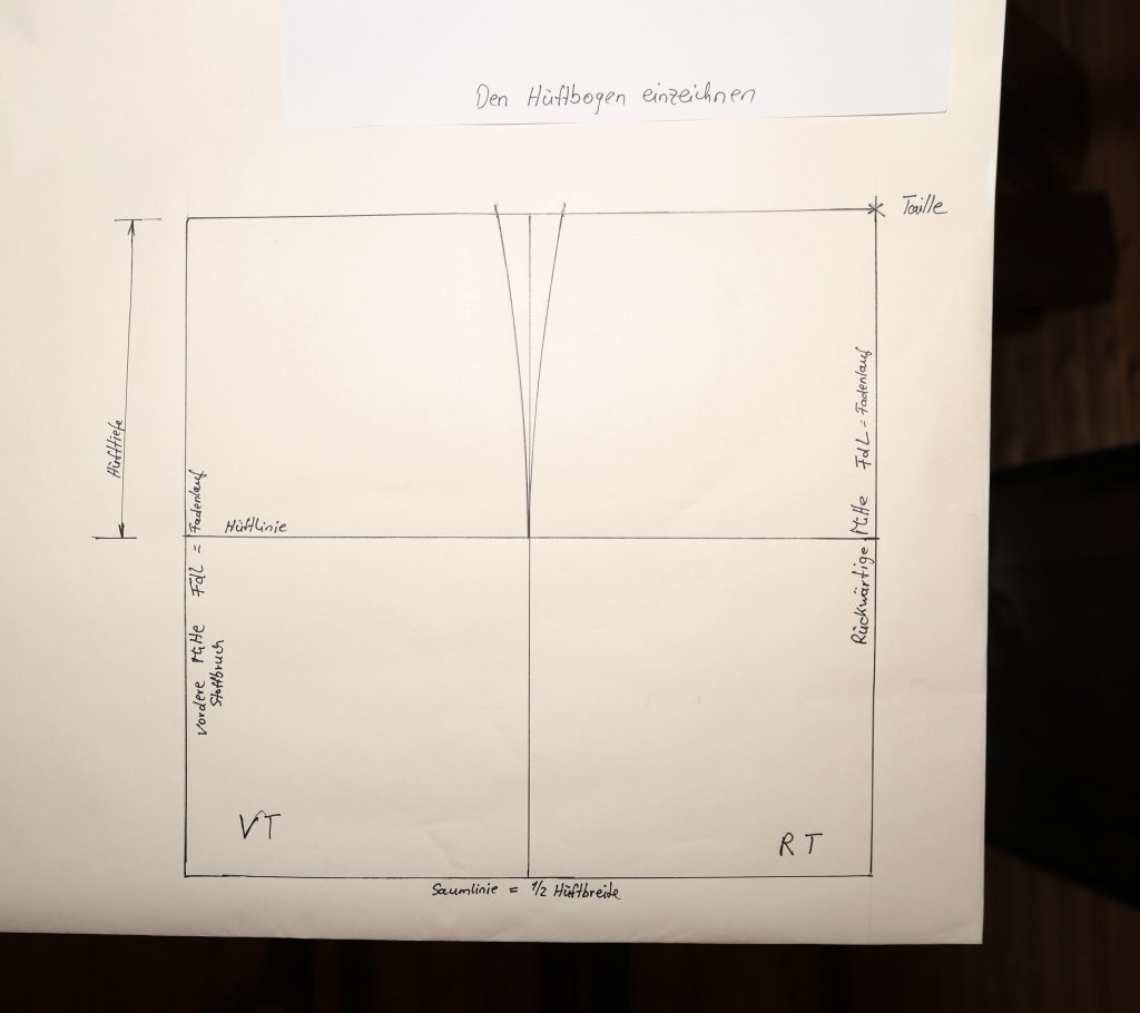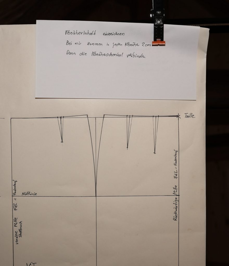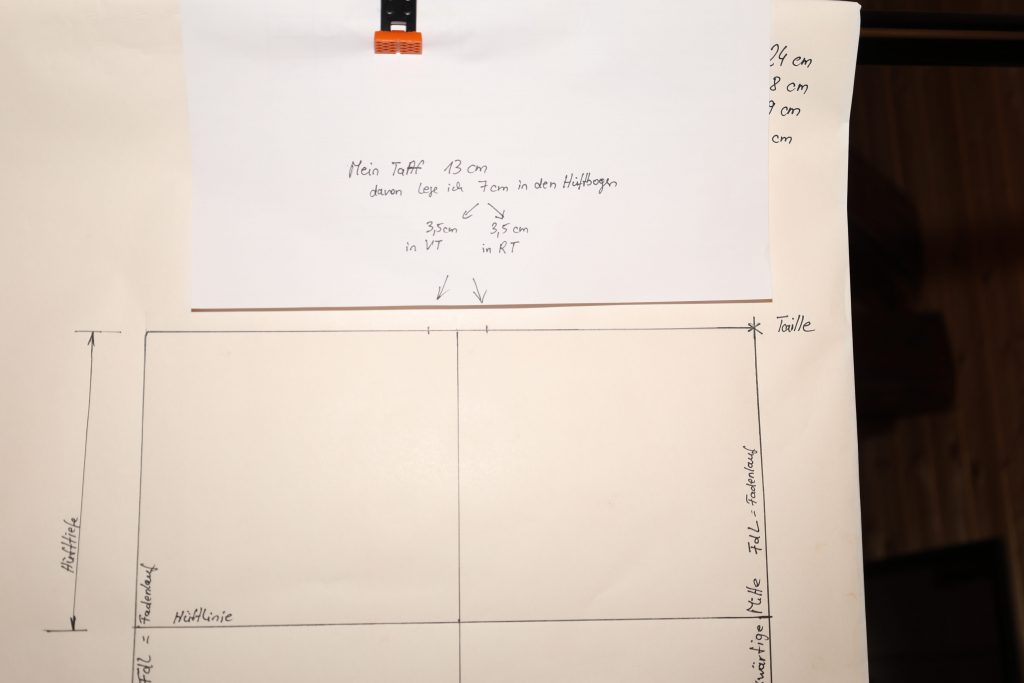 bitte vergesst nicht, die Hüftlinie auf das Probeteil zu zeichnen und die senkrechte vordere Mitte. Das soll zur Kontrolle dienen.