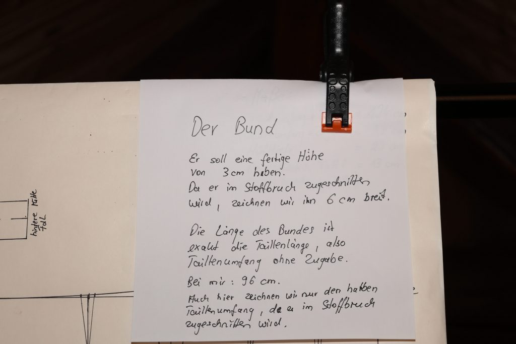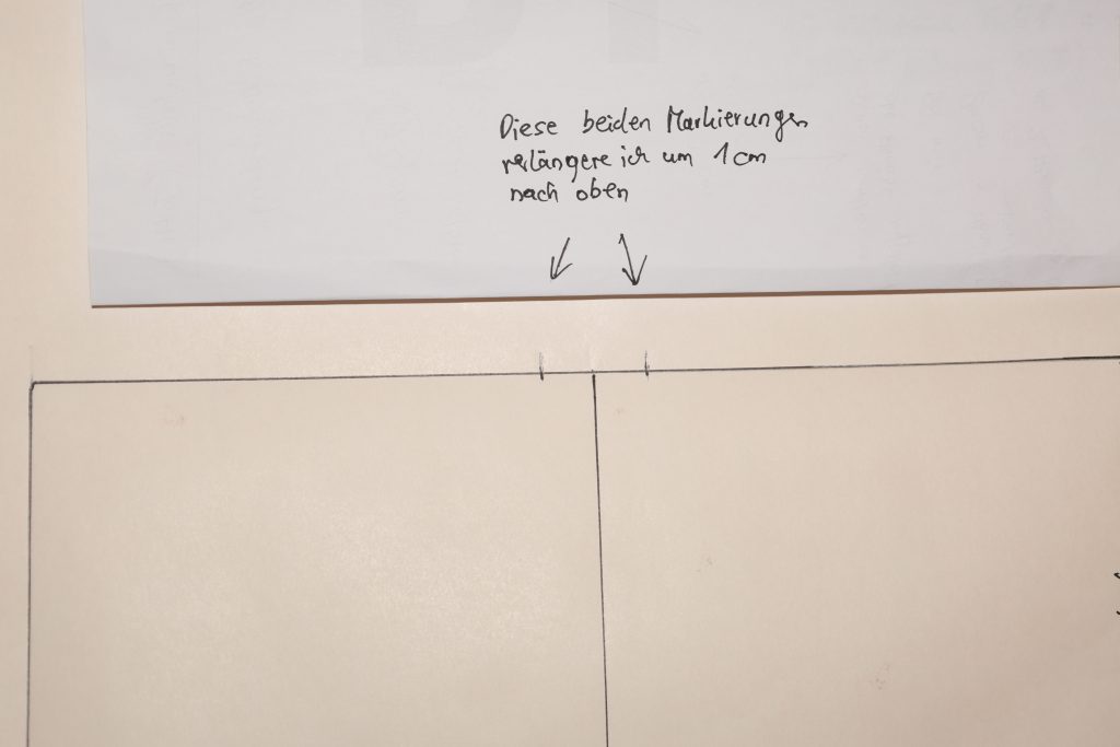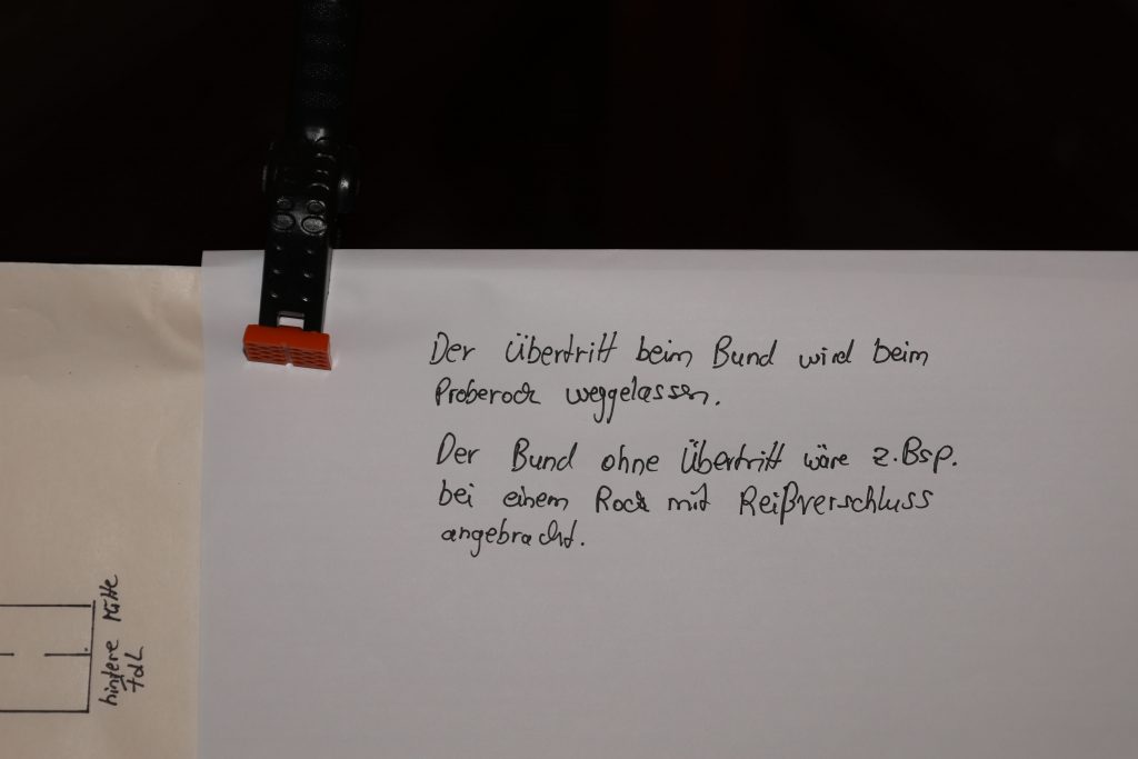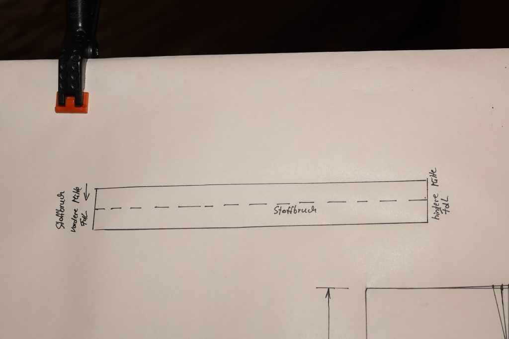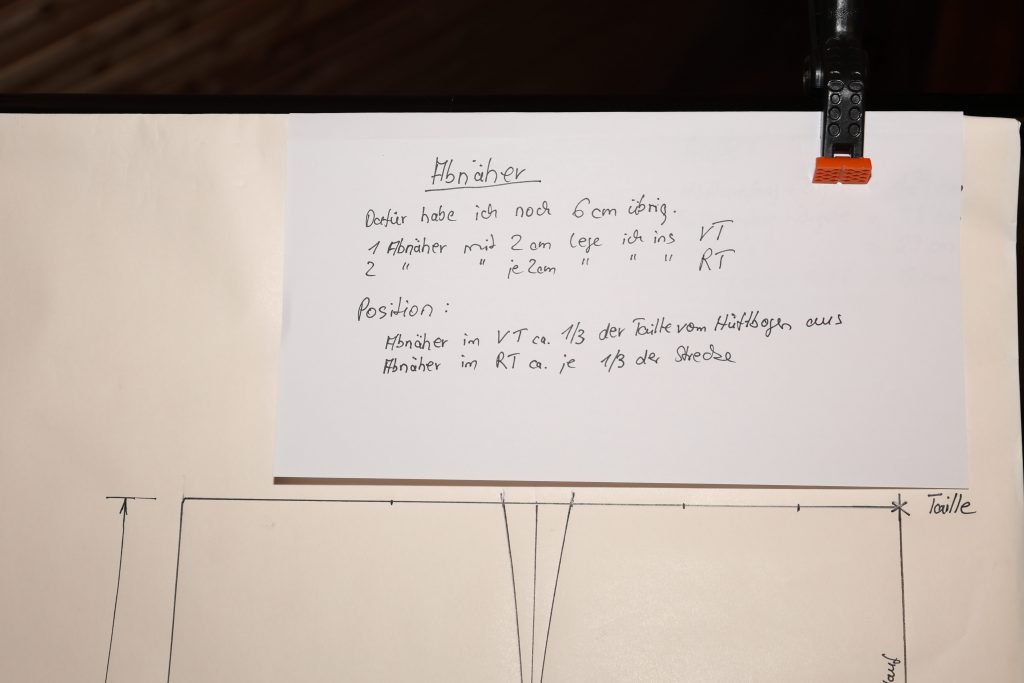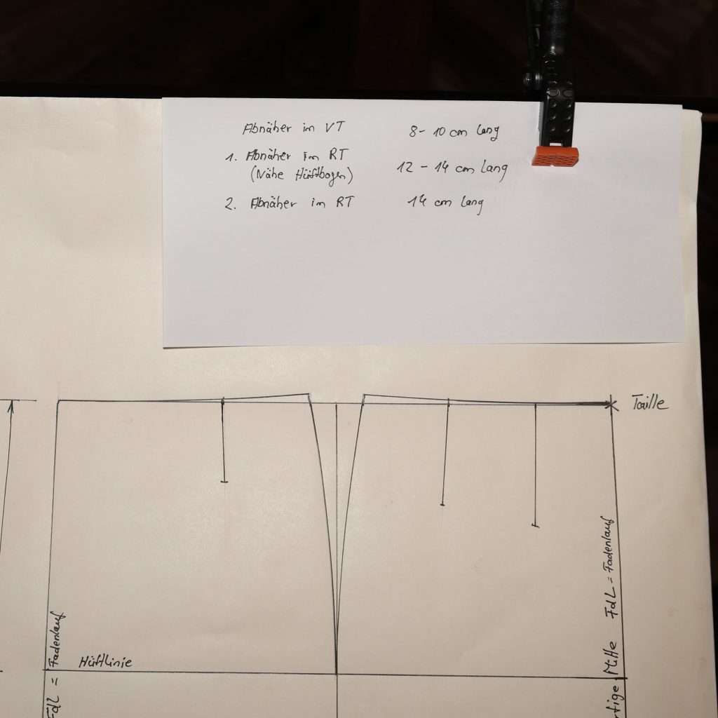 bitte vergesst nicht, die Hüftlinie auf das Probeteil zu zeichnen und die senkrechte vordere Mitte. Das soll zur Kontrolle dienen.